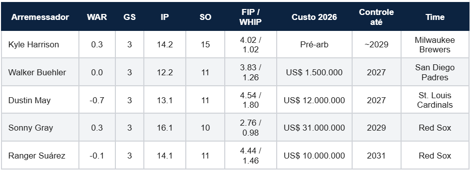 Sonny Gray e Ranger Suárez chegaram como a espinha dorsal da rotação. Gray está bem — 0.98 WHIP, FIP 2.76 —, Suárez não tanto por enquanto, mas tem talento de sobra para reverter.